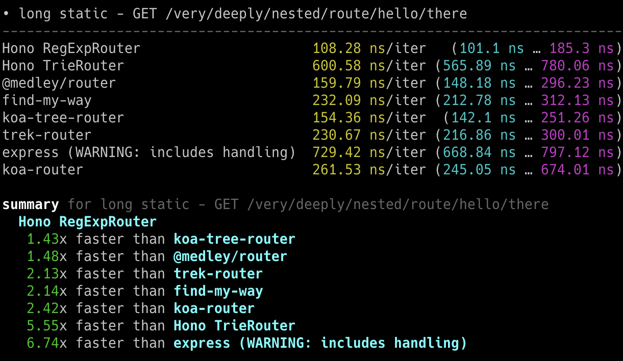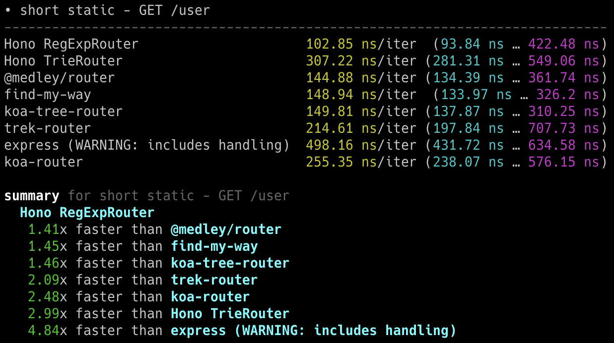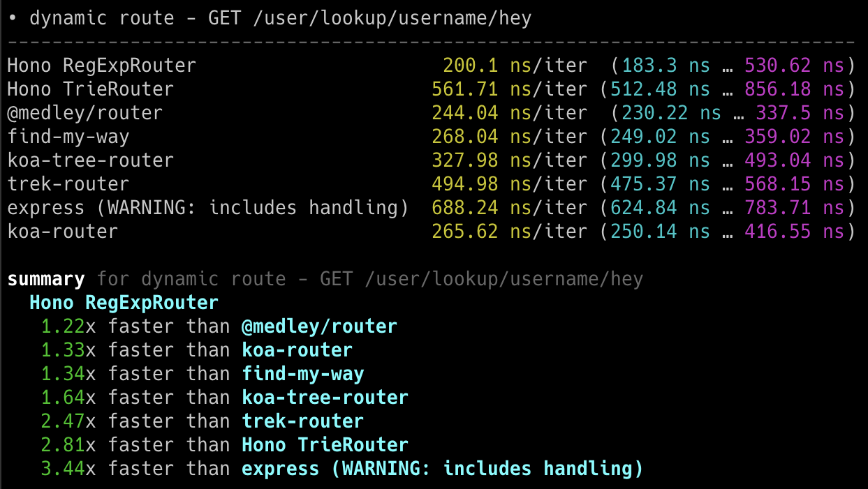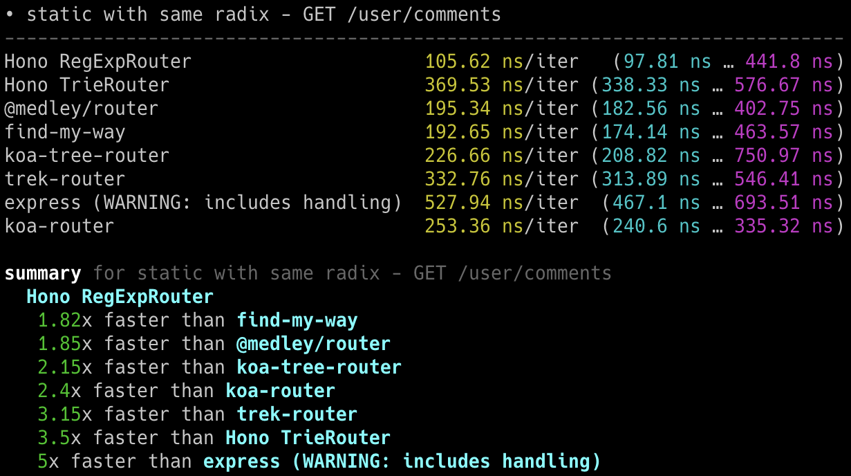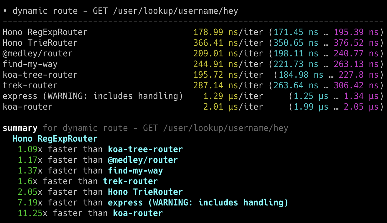 Hono x 402,820 ops/sec ±4.78% (80 runs sampled)