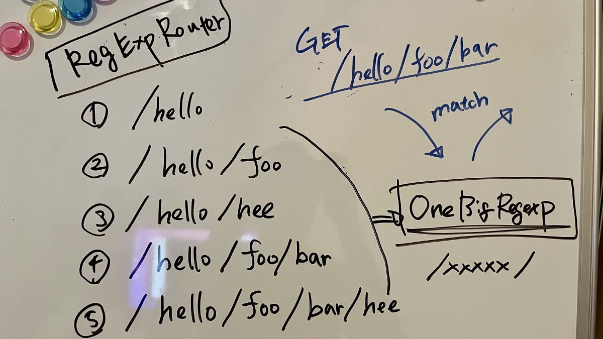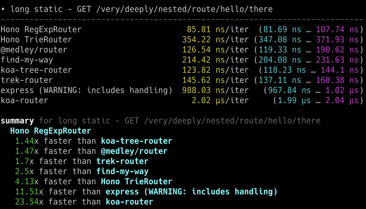 **RegExpRouter** 是 JavaScript 世界中最快的路由器。它使用调度前创建的单个大型 Regex 匹配路由。使用 **SmartRouter**,它支持所有路由模式。